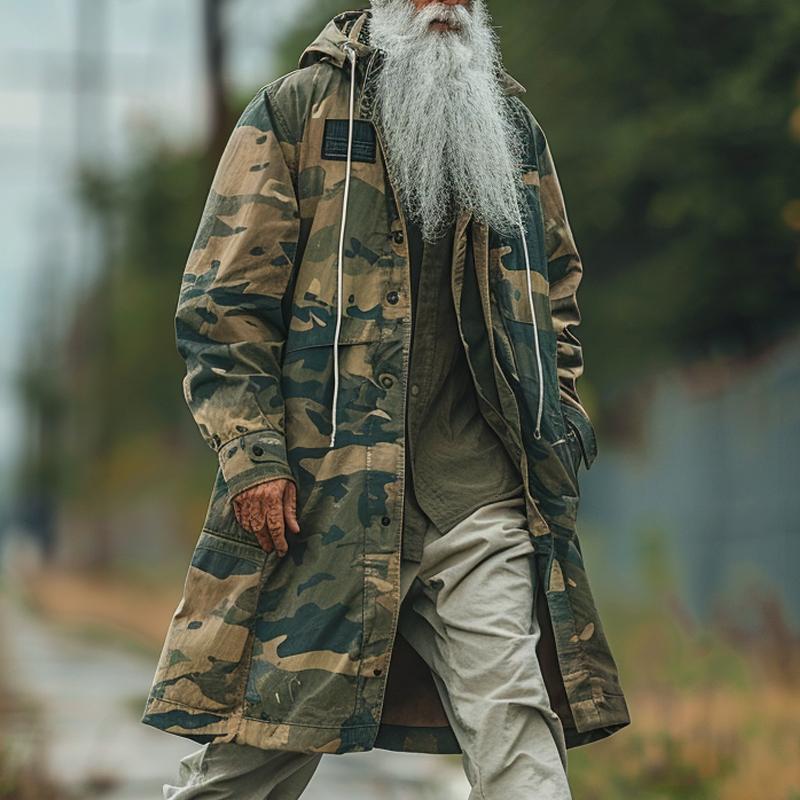 Elevate your outerwear game with our Men’s Camouflage Print Hooded Long Trench Coat—a perfect fusion of rugged style and functional design.