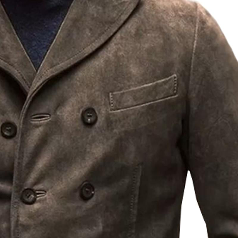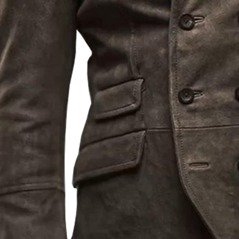 Crafted from polished suede, it boasts a distressed appearance, aiming to replicate a vintage style that can easily become a staple in your wardrobe. Designed in California, it features a 4-button, double-breasted style with a flat lapel and multiple pockets, creating a timeless and versatile silhouette that effortlessly complements both casual and formal outfits.