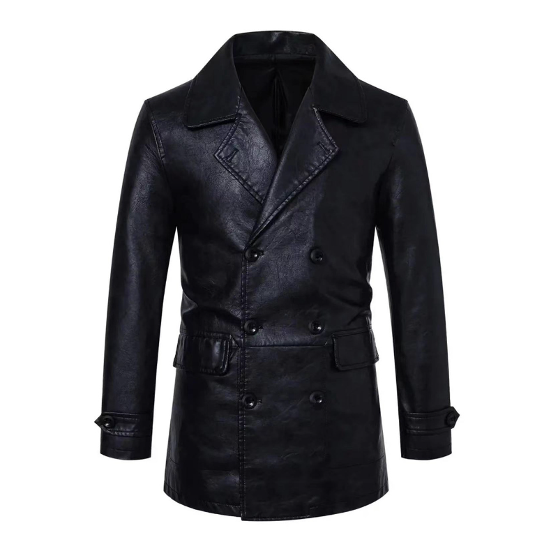 Elevate your outerwear collection with the Men’s Vintage Notch Lapel Double Breasted Slim Fit Leather Trench Coat, where classic style meets modern sophistication.